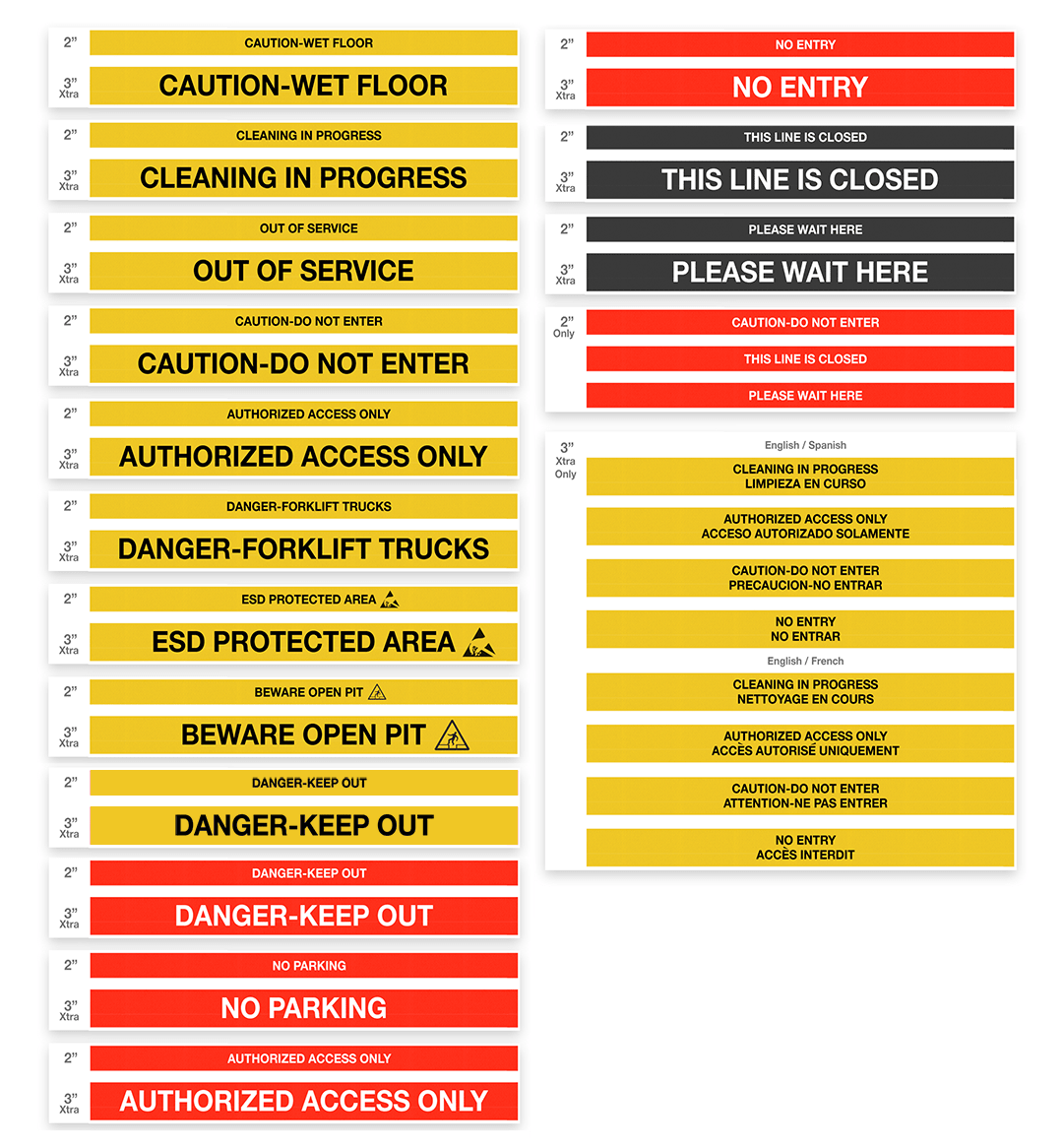 The high visibility yellow, red, or orange post finishes can be matched with a variety of high visibility belts including fluorescent colors, diagonal stripes, or printed safety messages making the "keep out" message clear. Stock-printed messages are printed on both sides of the belt.